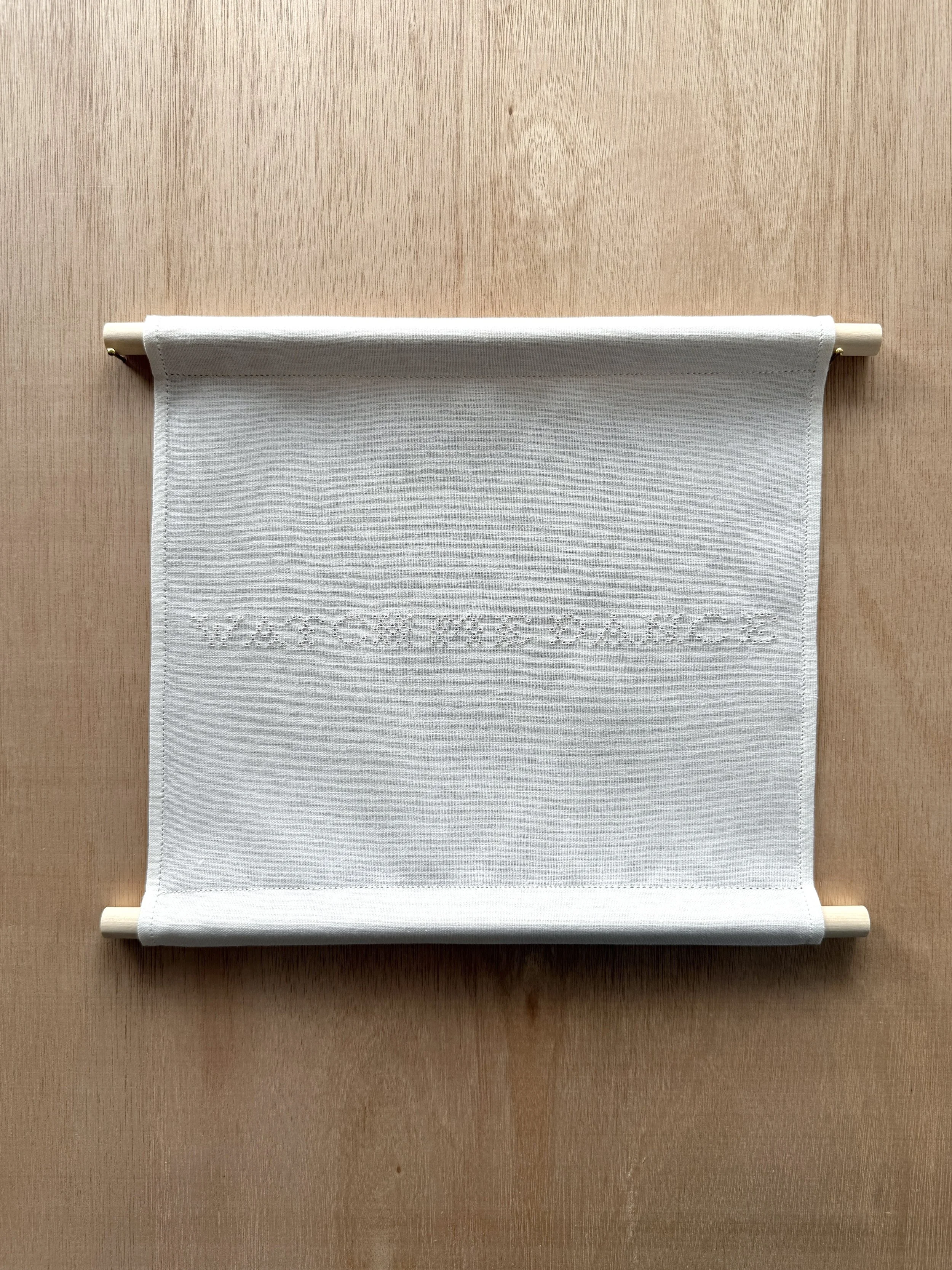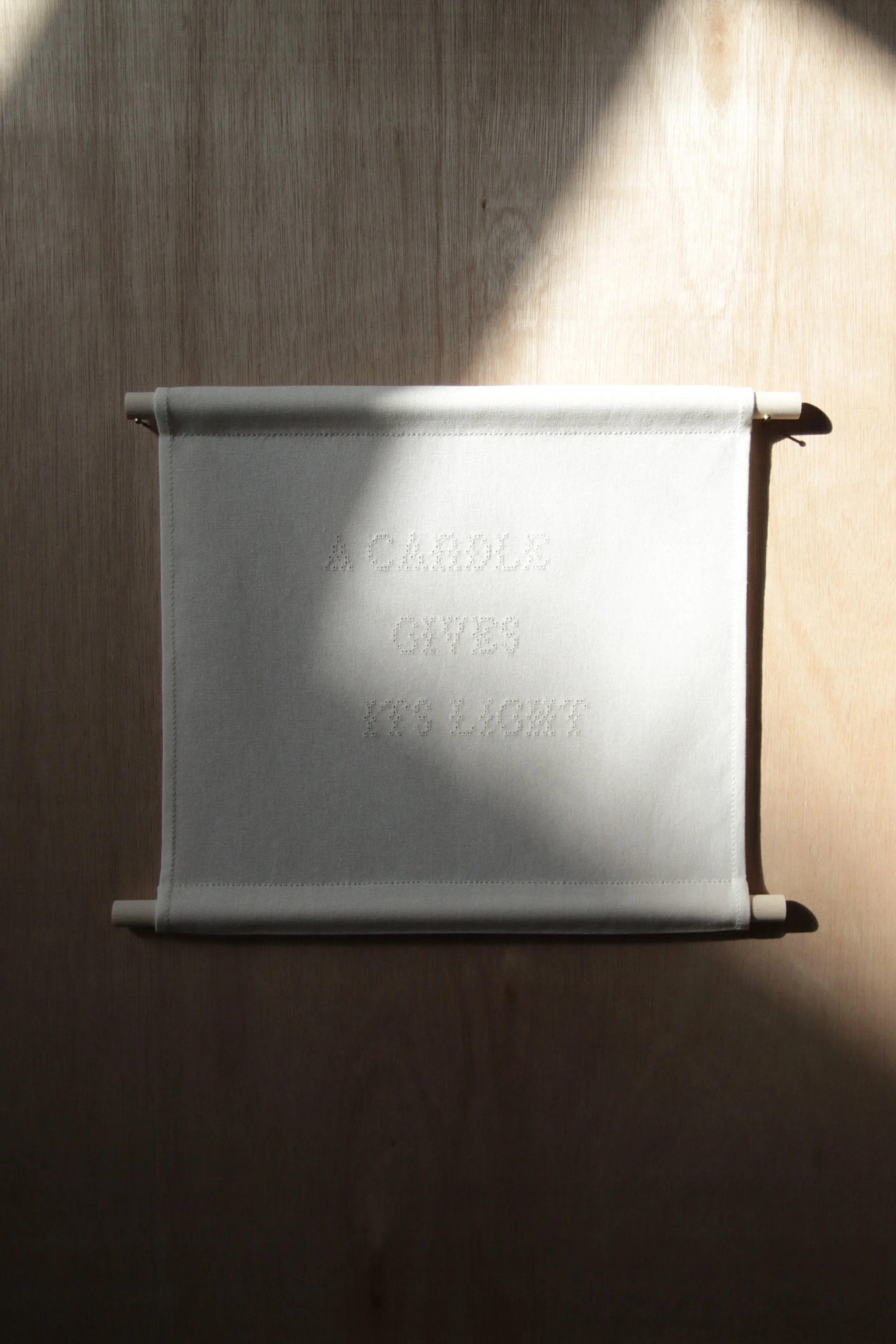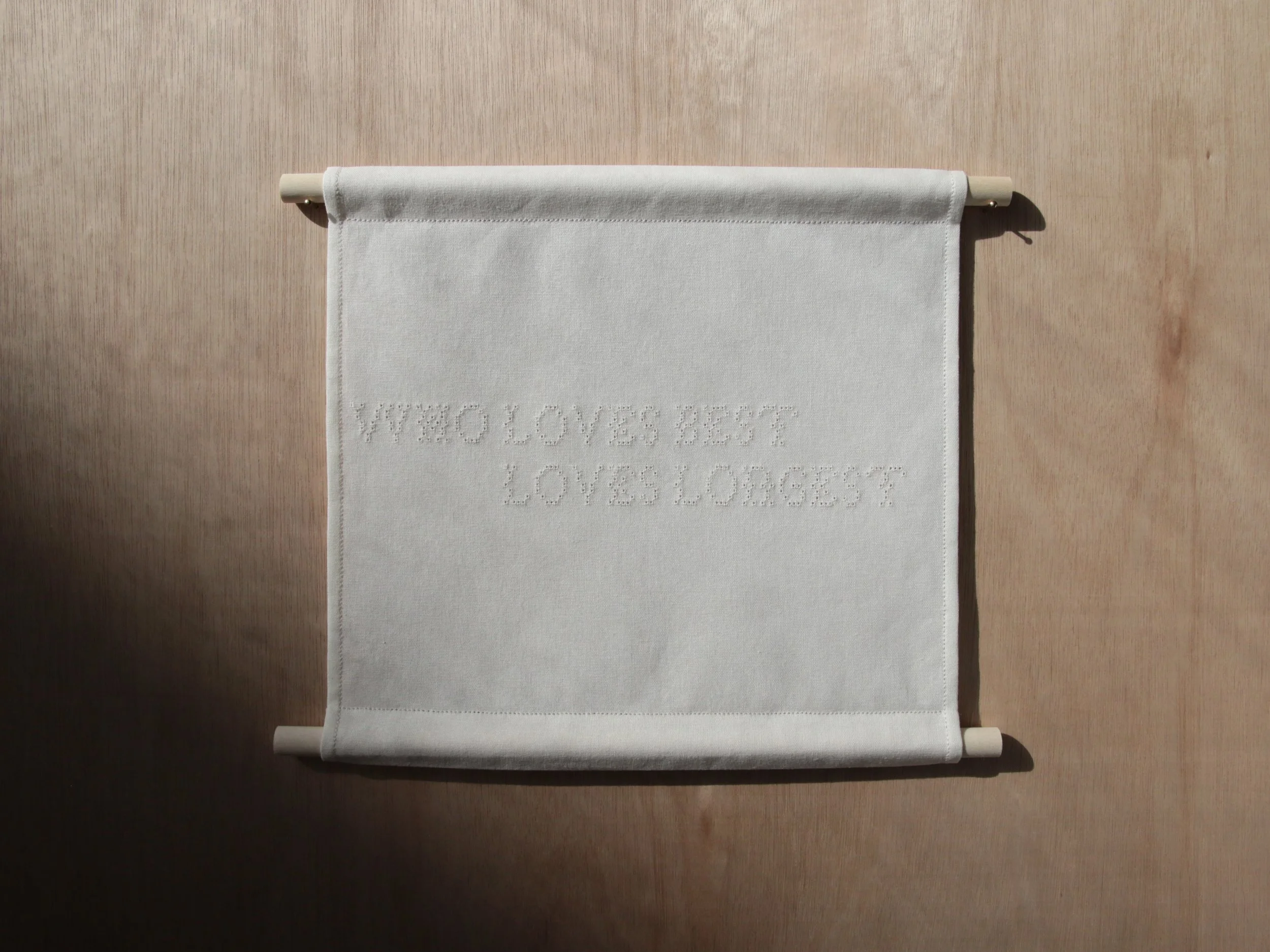 The work draws on the intimacy of cloth, the slowness of the hand, and the power of language to quietly hold meaning in shared time.
